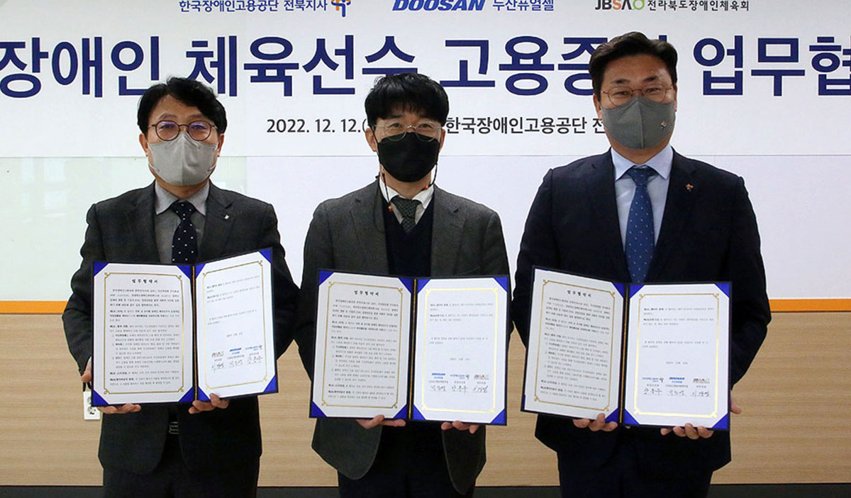 Doosan Fuel Cell is endeavoring to nurture the talented through human resource development and job creation. In particular, in order to create jobs for people with disabilities. We signed an agreement with the Jeonbuk Branch of the Korea Employment Agency for Persons with Disabilities and the Jeonbuk Para Sports Association to directly hire athletes with disabilities. The hired athletes with disabilities receive not only salaries but also training supplies such as uniforms, support for competition participation, and various welfare benefits. This enables them to train in a stable environment to improve their skills.
